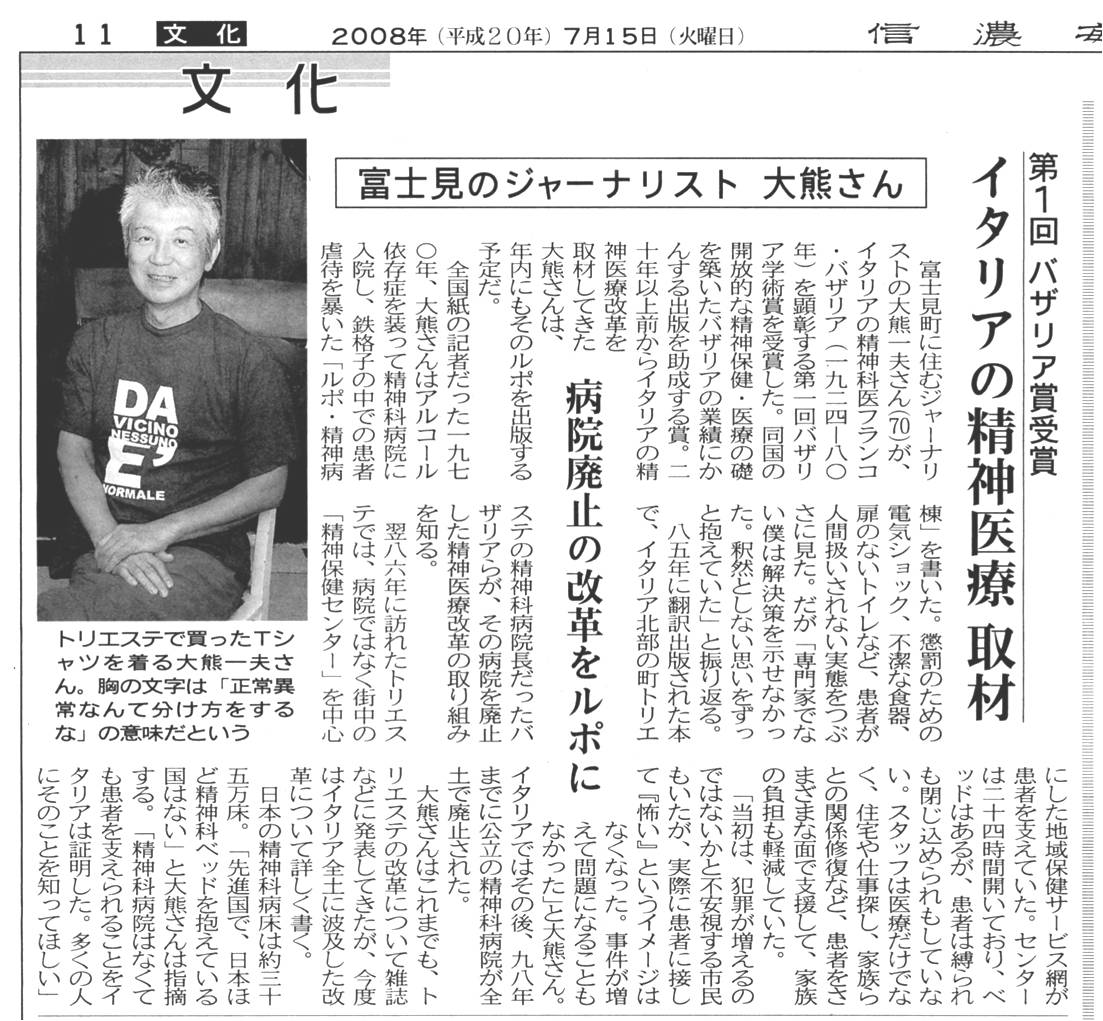 「第1回バザリア賞受賞 富士見のジャーナリスト 大熊さん」(信濃毎日新聞)「精神病院をぶっこわした国」の筆者にバザリア賞筆者はイタリアのフランコ・バザリア財団から『バザリア学術賞』を授与された。かつて精神病隔離の島だったヴェネツィアのサンセルヴォロ島で六月二四日、授賞式があった。 <続きは週刊金曜日710号にて> イタリアの第1回バザリア学術賞が『ルポ・精神病棟』の著者、大熊一夫氏に「イタリア精神保健改革の父」と称えられる精神科医、フランコ・バザリアの名を冠した「バザリア学術賞」の第1回受賞者に、『ルポ・精神病棟』で知られる日本人ジャーナリスト、大熊一夫氏が選ばれた。バザリアは半世紀も前に「精神病院は治療に不適切」と主張、イタリアでの精神病治療に大きな足跡を残した。 6月24日、イタリアのフランコ・バザリア財団(理事長、サッサリ大学教授マリア=グラツィア・ジャンニケッダ氏、事務局ヴェネチア県)は、ジャーナリストで元・大阪大学大学院教授の大熊一夫氏に、「イタリア精神保健改革の父」バザリアの名を冠した第1回バザリア学術賞を授与した。 ![]() 賞金2万ユーロの小切手を受け取った大熊一夫氏(右)と、左からバザリア財団理事長、同副理事長、ベネチア県文化担当副知事。 授賞式と関連セミナーは、同日午後4時から7時半まで、ヴェネチア本島から船で10分ほどのサン・セルヴォロ島(San Servolo)にあるバザリア・ホールで行なわれた。 「バザリアの見通した人権と精神保健」と題する記念セミナーでは、ヴェネチア県知事、同市長、精神科医、患者などに加え、受賞者の大熊一夫氏が熱弁をふるった。 ![]() バザリア・ホールいっぱいの聴衆。 およそ200人の聴衆が熱心に耳を傾ける中、大熊一夫氏は、「イタリアと日本:民主主義国家における精神医療施設の夢と悪夢」と題する講演をイタリア語でおこなった。講演後、あるイタリア人は、「聞いていて涙が出てきました」と言って駆け寄ってきた。 フランコ・バザリア(1924年生まれ、1980年没)は、イタリアの精神保健改革の先駆者といわれる精神科医。「精神病院は治療に極めて不適格」と今から半世紀も前に主張した。彼の業績を記念したフランコ・バザリア財団(出資はバザリアの生まれ故郷ヴェネチア県)は、昨年「バザリア学術賞」を創設し、世界から受賞者を公募した。 この賞は、「申請者の国において申請者の国の言葉で出版する」ことを条件に、バザリアの業績についての調査研究を助成するのが目的。大熊一夫氏は、これに応募し、米国のイェール大学、バークレイ大学、オーストラリアのウオロンゴング大学等の研究チームと競って、単独応募で第1回の受賞者に選ばれた。賞金2万ユーロ(約350万円)が、この日の授賞式典でヴェネチア県から小切手で大熊氏に贈られた。 財団のイタリア人審査委員会は、大熊氏の申請書から先進国の中で日本だけが極端な精神病院中心主義なのを知って、イタリアの精神保健改革に関する本を日本で出版する意義は大きい、と判断した。同氏が38年前に書いた『ルポ・精神病棟』(朝日新聞社刊)が累積約30万部出版されたこと、過去20年間、幾度か改革の中心地トリエステなどを訪問して新聞や雑誌等に記事を書き、その記事がもとでトリエステを訪れた日本人が1,000人を超えたことなども勘案され、審査委員の全員一致で選ばれた。 大熊氏によると、イタリアは単科精神病院をなくした世界唯一の国とのこと。精神病院廃止を決めた180号法は「バザリア法」と呼ばれ、1978年5月に施行された。改革が始まって、今年でちょうど30年になる。 授賞式の行われたサン・セルヴォロ島も、改革前は精神病の人々を隔離収容する島だった。しかし、いま、病院は完全に消滅した。その建物は改装され、ヴェネチア国際大学と国際会議場の島に生まれ変わった。 ![]() サン・セルヴォロ島の精神病院博物館。 サン・セルヴォロ島の一角は、「精神病院博物館」として残されている。そこには、治療の名のもとに使われた器械、体を縛るさまざまな道具、さらには“研究”に使われた患者の脳や頭蓋骨などが保存・展示されている。 同島から1kmほど離れたサン・クレメンテ島も、精神病隔離の島として使われていたが、こちらは何と5つ星ホテルになった。これら2つの大収容所が消えた今日、これに代わる地域精神保健サービス網が、ヴェネチア県各地で展開されている。 かつて約12万人を収容した「マニコミオ」と呼ばれる公立単科精神病院は、1998年末でイタリアからなくなった。イタリアの人口は約5,600万で、日本のほぼ半分だから、日本に置き換えれば日本の精神病棟の24万床が日本社会から消えたことになる。因みに、現在の日本の精神病棟は約34万床だ。 大熊氏によると、イタリアの特色は、精神病院を廃止した後、治療する場の軸足が精神保健センターに移った点。診療・往診は当然のこと、人間関係の修復・住居の確保・就職斡旋・楽しみの開発など、「当事者の人生丸ご
