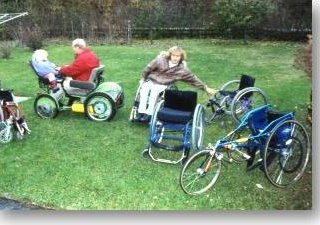 車いす短距離走世界選手権保持者モニカさんの車いすを庭へ出してもらった 通勤用、室内用、競技用・・・六台も出てきた |