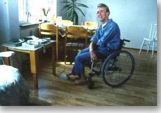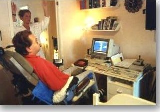 息を吹きかけるだけで、パソコンも車いすも操作 この人は8時間労働のヘルパー三人に支えられて生活する |
