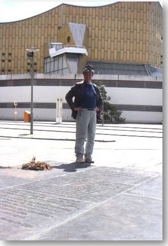 この動物園通り4番地にはナチス障害者安楽死計画を遂行する本部があった 本部跡地の地面には世紀の蛮行をいさめる碑文が埋め込まれていた 背景はベルリンフィルハーモニーホール |