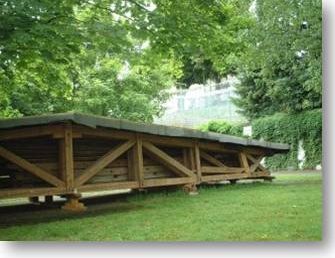患者輸送公益有限会社の大型バスに乗せられた 患者・障害者たちは病院裏の車庫でバスを降ろされた その車庫の屋根の部分だけが ハダマール病院の裏庭に今も残されている |