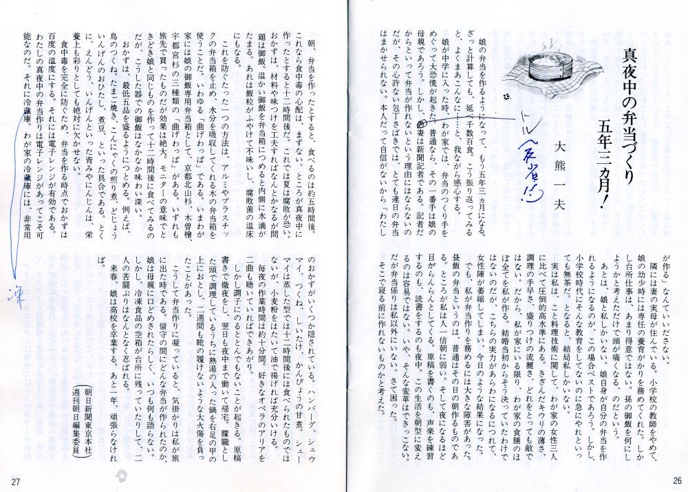 名前:おおくま かずお(大熊 一夫) 職業:ジャーナリスト 経歴:東京生まれ。東京大学教養学部教養学科『科学史・科学哲学』を 卒業して朝日新聞記者に。週刊朝日副編集長、アエラ・スタッフライター をへて無所属のジャーナリストに 1998年から大阪大学人間科学部教授。講座はソーシャルサービス論。 日本の国立大学に初めて出来た福祉系講座の初代教授。 2002年に定年退官 ささやかな業績:1970年、アルコール依存症を装って精神病院に 潜入入院し、『ルポ精神病棟』を朝日新聞社会面に連載。 鉄格子の内側で日常的に行われていた入院者虐待を白日のもとにさらし、 日本の精神医療改革に一石を投じる 現在:八ヶ岳山麓で、料理、山歩き、ジョギング、薪割り、……etc。同居人あり。 趣味:声楽(オペラを歌うのだ!) 初リサイタルの記録!! ![]() クリックすると拡大されます。 出典:夜中の薔薇 向田邦子著(講談社 1981年) つまらない自慢:20数年前、娘の中学高校時代6年間の弁当約1000食を作った。 ![]() クリックすると拡大されます。 出典:季刊「うまいもの」第30号(うまいもの社 1986年) ナポリ風ピッツァの石窯を自作した(リストランテを開業する予定はありません) 気になる人:ズィーモン・ヴィーゼンタール(英語読みはサイモン・ウィーゼンタールですがオーストリア人なので)。ウクライナ生まれのユダヤ人で絶滅収容所の生き残り。05年9月23日96歳で死去。 ホロコーストに関わったナチの犯罪人たちを戦後、執拗に追いかけた。網にかかった者1100人とか。ホロコースト実務最高責任者の1人、かのアドルフ・アイヒマンをアルゼンチンで捕まえたのも彼の功績だ。執念、調査能力……彼はジャーナリストではないがジャーナリストの鑑 |