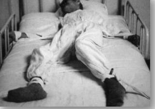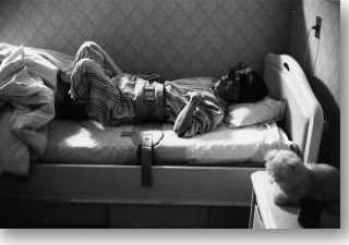 毎晩12時間、全身6ヶ所も紐で縛られる。219人の入院者の4分の1ほどがこんな目にあう。 超高感度フィルムで撮影し増感現像してやっと浮び上がった映像。(ルポ老人病棟) |