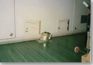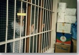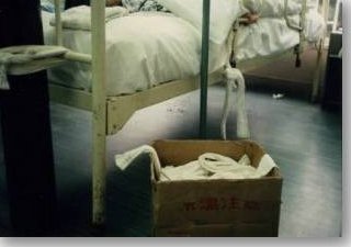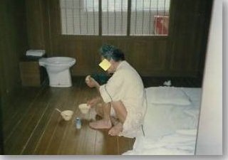 廊下側の扉が施錠された北側の6人部屋。窓に鉄格子。ポータブル便器1つ。 院長は渋ちんで天井の蛍光灯も消してしまう。(『母をくくらないで下さい』) |